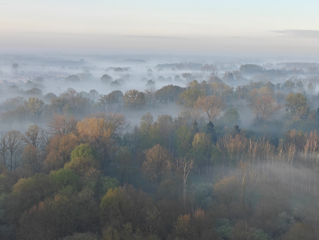 We trokken naar Wechelderzande voor een prive ballonvaart voor 4 personen en vertrokken iets na 7u met onze 3bouw luchtballon vanaf de weide van onze passagiers. De regen van gisteren in combinatie met een koude nacht zorgde voor plaatsen met wat ochtendnevel. Prachtig om vanuit de lucht te zien en het gaf onze vaart een feeƫrieke sfeer. Aan de grond bijna geen wind en op hoogte een mooie snelheid van 25km/u waardoor we een hele afstand aflegden. Via Lille en Poederlee ging het naar Herentals waar de marktkramers van de zondagsmarkt al opgesteld stonden. Onze ballontocht ging verder via Olen waar we boven domein Teunenberg konden genieten van de kleurrijke natuur onder ons. Een geschikte ladingsplaats vonden we in Tongerlo naast de Beddermolen van Kempens Landschap.