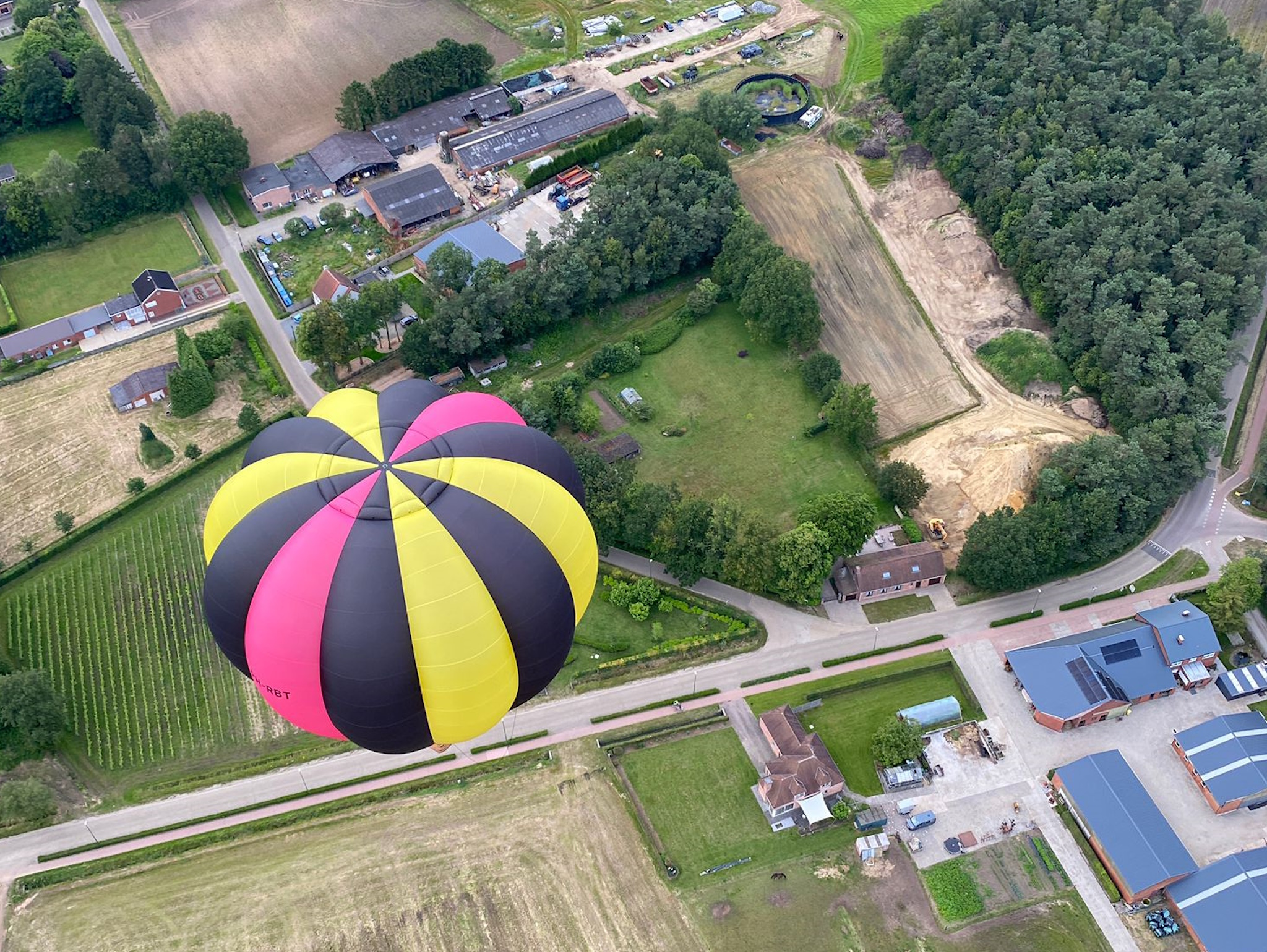 Wisselvallig weer de laatste periode waardoor het telkens dag op dag afwachten is of de ballonvaart kan doorgaan. Ondanks de bewolking was het vandaag toch prima ballonweer. Onze piloot Bart maakte vandaag zijn 1000ste ballonvaart. We vertrokken met onze wesp ballon ten noorden van Geel. Een zwakke zuidenwind bracht ons tot boven de markt. Via Winkelomheide ging het vervolgens verder naar Oosterlo waar de ballon op een droog en kort gemaaid voetbalveld werd neergezet.