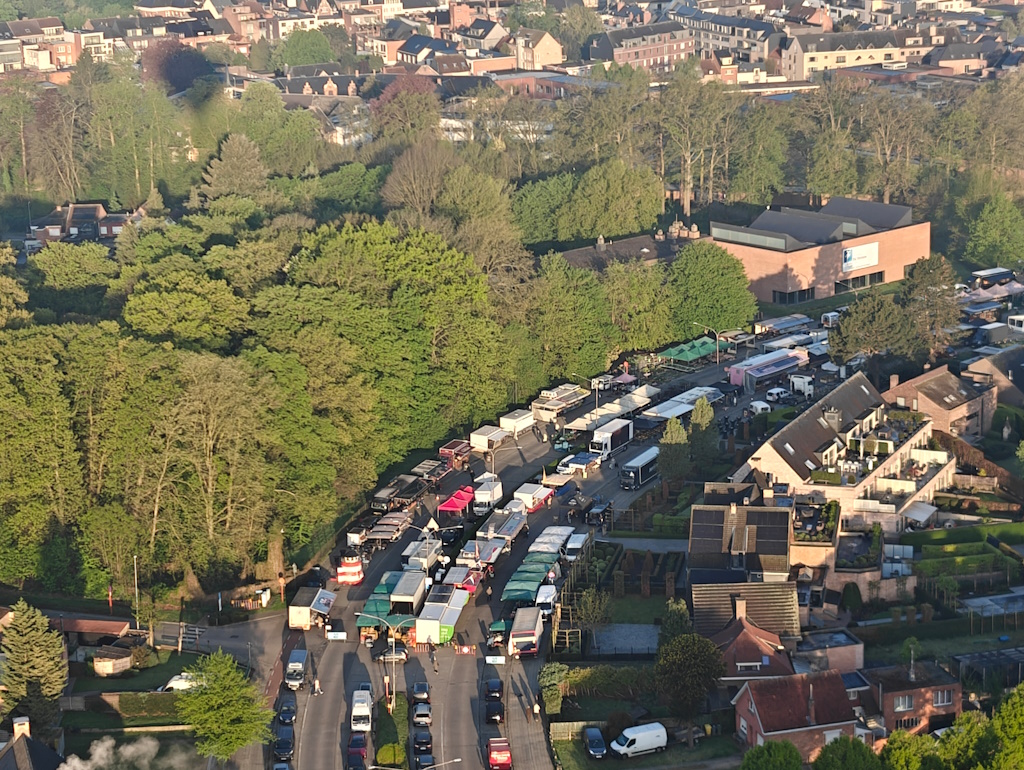 We trokken naar Wechelderzande voor een prive ballonvaart voor 4 personen en vertrokken iets na 7u met onze 3bouw luchtballon vanaf de weide van onze passagiers. De regen van gisteren in combinatie met een koude nacht zorgde voor plaatsen met wat ochtendnevel. Prachtig om vanuit de lucht te zien en het gaf onze vaart een feeƫrieke sfeer. Aan de grond bijna geen wind en op hoogte een mooie snelheid van 25km/u waardoor we een hele afstand aflegden. Via Lille en Poederlee ging het naar Herentals waar de marktkramers van de zondagsmarkt al opgesteld stonden. Onze ballontocht ging verder via Olen waar we boven domein Teunenberg konden genieten van de kleurrijke natuur onder ons. Een geschikte ladingsplaats vonden we in Tongerlo naast de Beddermolen van Kempens Landschap.